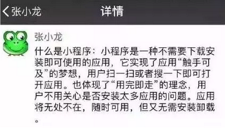 什么是微信小程序呢?根據(jù)張小龍的官方解釋,微信小程序,簡稱CX,是一種不需要下載安裝即可使用的應用,它實現(xiàn)了應用“觸手可及”的夢想,用戶掃一掃或搜一下即可打開應用。用最簡明扼要、通俗易懂的關鍵詞概括就是:又小又快的應用。體積小,不超過1M,打開快速,用完即走,來去自如,和進入一個網(wǎng)站頁面差不多的感覺。