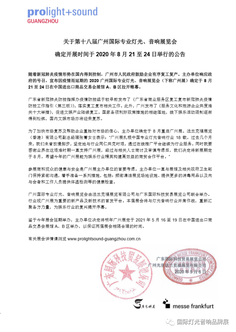 廣州燈光音響展設(shè)計搭建公司領(lǐng)藝展覽了解到,隨著新冠肺炎疫情形勢在國內(nèi)得到控制,廣州市人民政府鼓勵企業(yè)有序復(fù)工復(fù)產(chǎn)。主辦單位響應(yīng)政府的號召,宣布因疫情而延期的2020廣州國際專業(yè)燈光、音響展覽會(下稱廣州展)確定于8月21至24日在中國進(jìn)出口商品交易會展館A、B區(qū)拉開帷幕。如需廣州燈光音響展設(shè)計請聯(lián)系領(lǐng)藝展覽,希望我們能在廣州燈光音響展搭建上為您添磚加瓦,祝各位朋友收獲多多,滿載而歸!