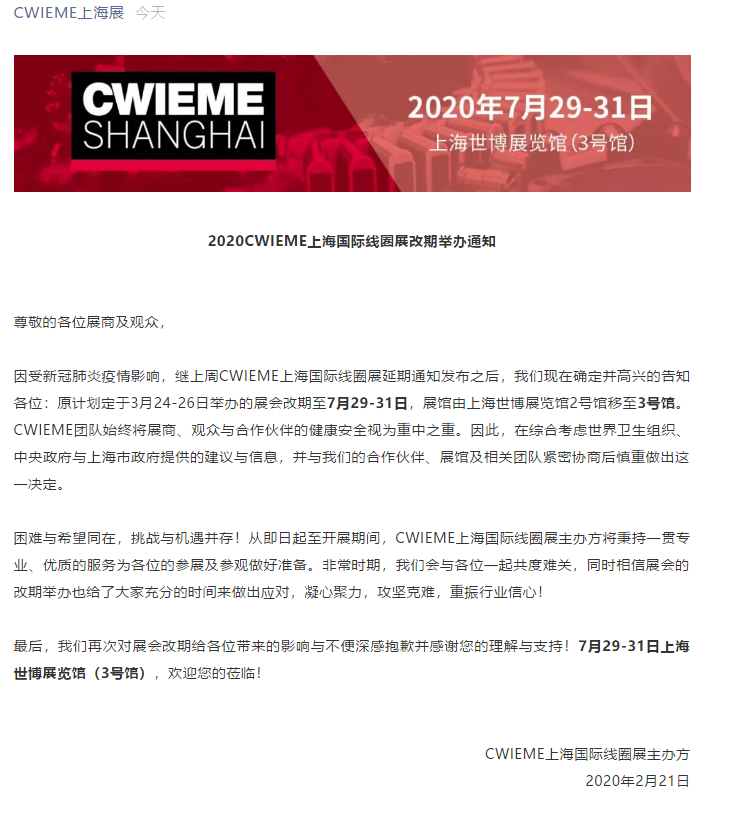 根據(jù)上海線圈展設(shè)計搭建公司領(lǐng)藝展覽了解到,因受新冠肺炎疫情影響,繼上周CWIEME上海國際線圈展延期通知發(fā)布之后,原計劃定于3月24-26日舉辦的展會改期至7月29-31日。如需線圈展設(shè)計請聯(lián)系領(lǐng)藝展覽,希望我們能在線圈展搭建上為您添磚加瓦,祝各位朋友收獲多多,滿載而歸!