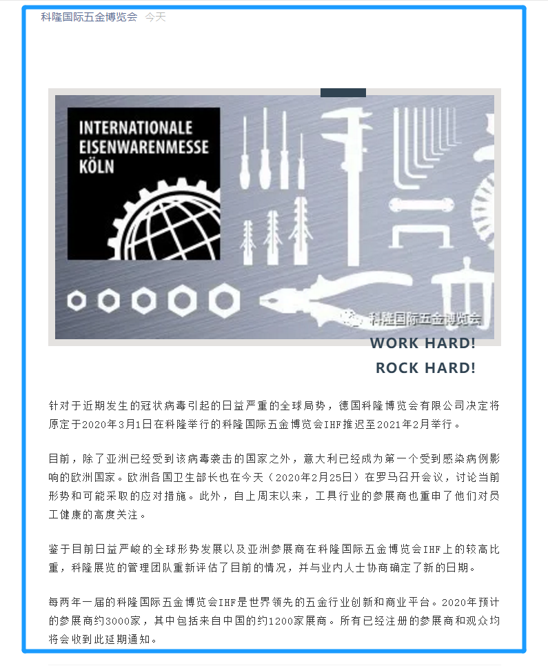目前,除了亞洲已經(jīng)受到該病毒襲擊的國家之外,意大利已經(jīng)成為第一個(gè)受到感染病例影響的歐洲國家。歐洲各國衛(wèi)生部長也在今天(2020年2月25日)在羅馬召開會(huì)議,討論當(dāng)前形勢和可能采取的應(yīng)對措施。此外,自上周末以來,工具行業(yè)的參展商也重申了他們對員工健康的高度關(guān)注。鑒于目前日益嚴(yán)峻的全球形勢發(fā)展以及亞洲參展商在科隆國際五金博覽會(huì)IHF上的較高比重,科隆展覽的管理團(tuán)隊(duì)重新評估了目前的情況,并與業(yè)內(nèi)人士協(xié)商確定了新的日期。每兩年一屆的科隆國際五金博覽會(huì)IHF是世界領(lǐng)先的五金行業(yè)創(chuàng)新和商業(yè)平臺(tái)。2020年預(yù)計(jì)的參展商約3000家,其中包括來自中國的約1200家展商。所有已經(jīng)注冊的參展商和觀眾均將會(huì)收到此延期通知。如需五金展設(shè)計(jì)請聯(lián)系領(lǐng)藝展覽,希望我們能在五金展搭建上為您添磚加瓦,祝各位朋友收獲多多,滿載而歸!