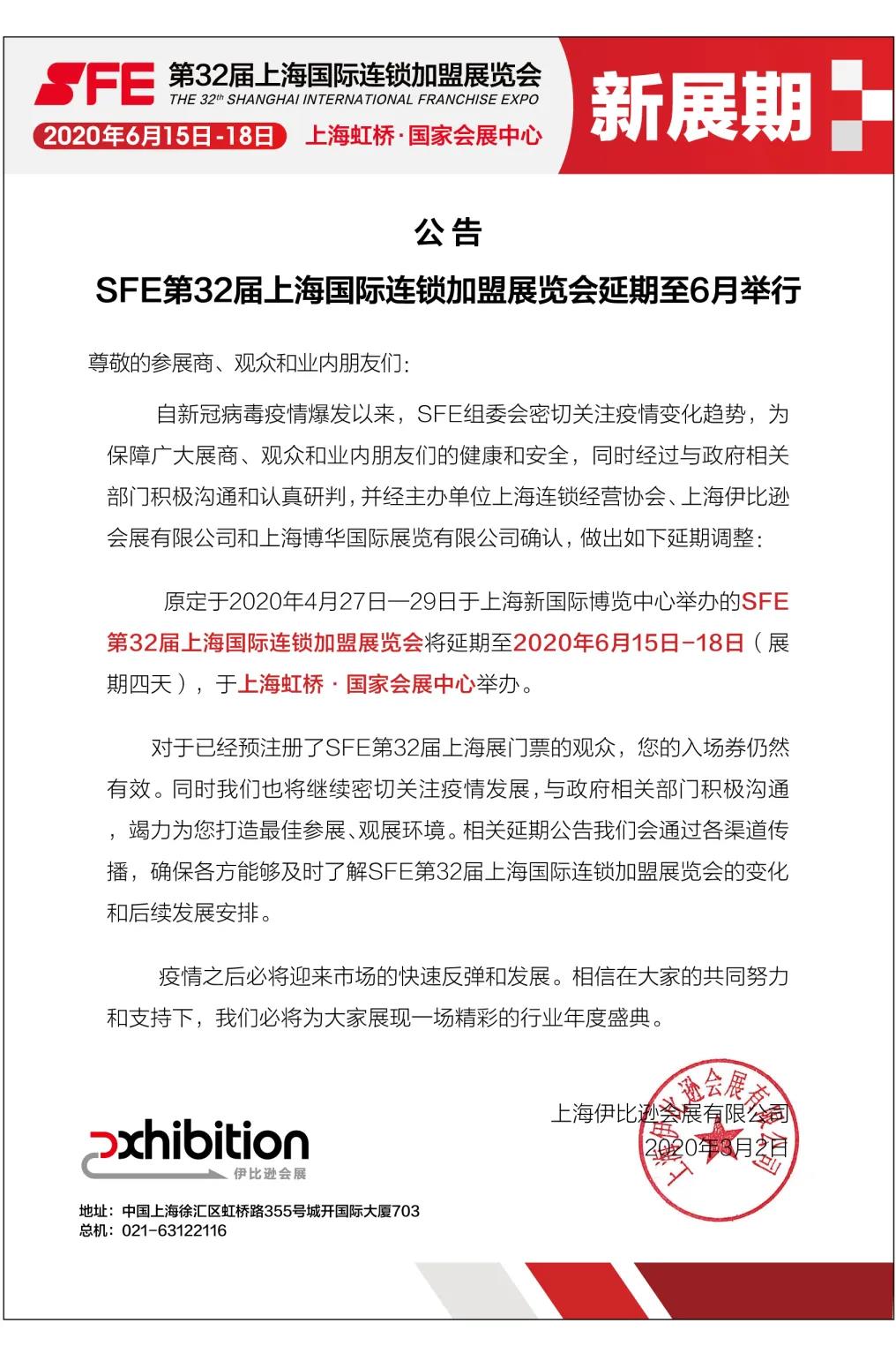 根據(jù)上海連鎖加盟展設(shè)計搭建公司領(lǐng)藝展覽了解到,6月15日-18日,連鎖加盟行業(yè)巔峰盛會——SFE第32屆上海國際連鎖加盟展覽會,將會在上海虹橋·國家會展中心盛裝亮相! 如需上海連鎖加盟展設(shè)計請聯(lián)系領(lǐng)藝展覽,希望我們能在上海連鎖加盟展搭建上為您添磚加瓦,祝各位朋友收獲多多,滿載而歸!