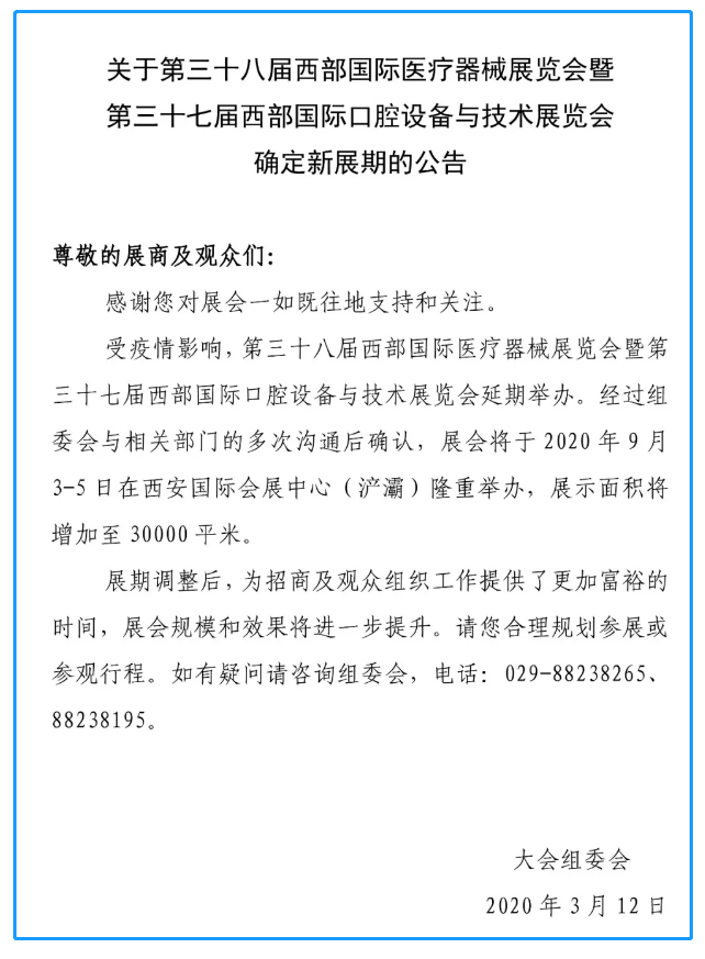 根據(jù)西部醫(yī)療展設(shè)計(jì)搭建公司領(lǐng)藝展覽了解到,受疫情影響,第三十八屆西部國(guó)際醫(yī)療器械展覽會(huì)調(diào)整至2020年9月3-5日在西安國(guó)際會(huì)展中心(浐灞)隆重舉辦。如需西部醫(yī)療展設(shè)計(jì)請(qǐng)聯(lián)系領(lǐng)藝展覽,希望我們能在西部醫(yī)療展搭建上為您添磚加瓦,祝各位朋友收獲多多,滿載而歸!